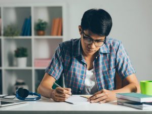 College student doing homework at home
