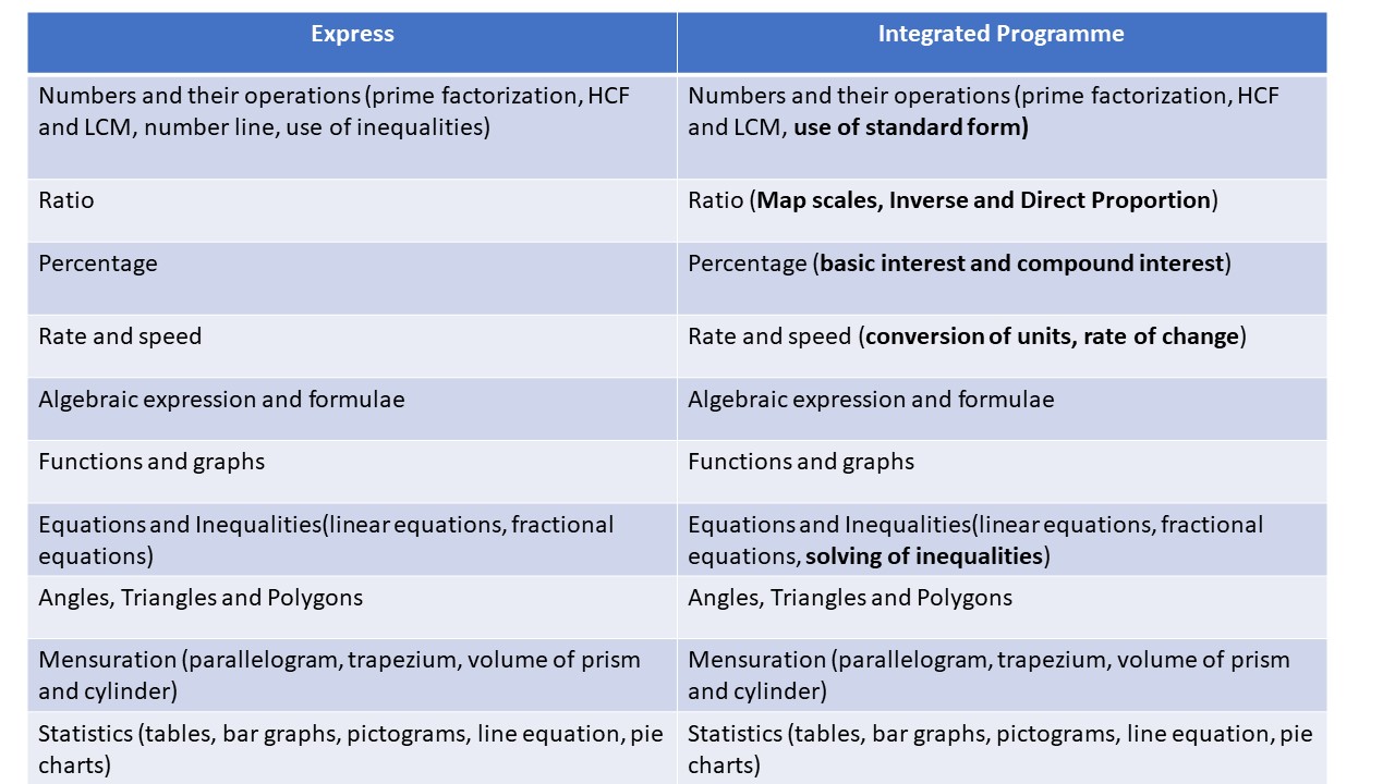 This is a table of comparison for Express and IP Math for Y3-Y4. Note that this list is not exhaustive.