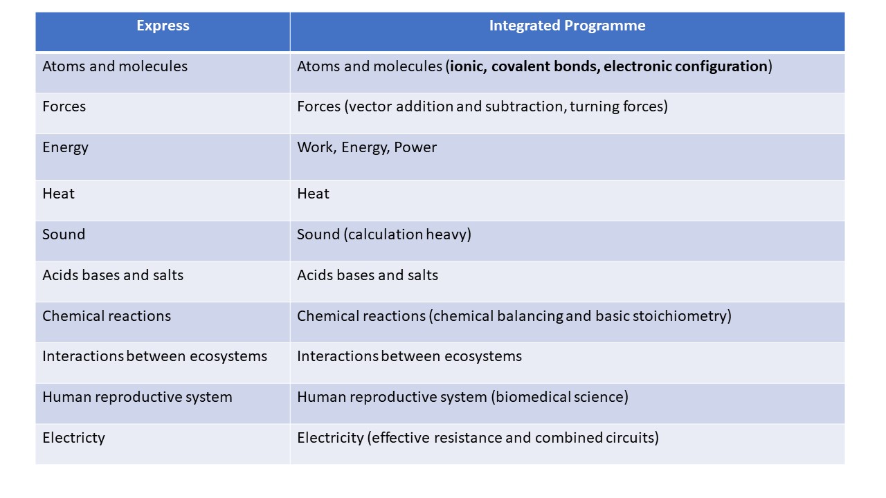 This is a table of comparison for Express and IP Science for Y2. Bolded are the topics unique to IP, which are from the sec3 to sec4 O-level text. Note that this list is not exhaustive.