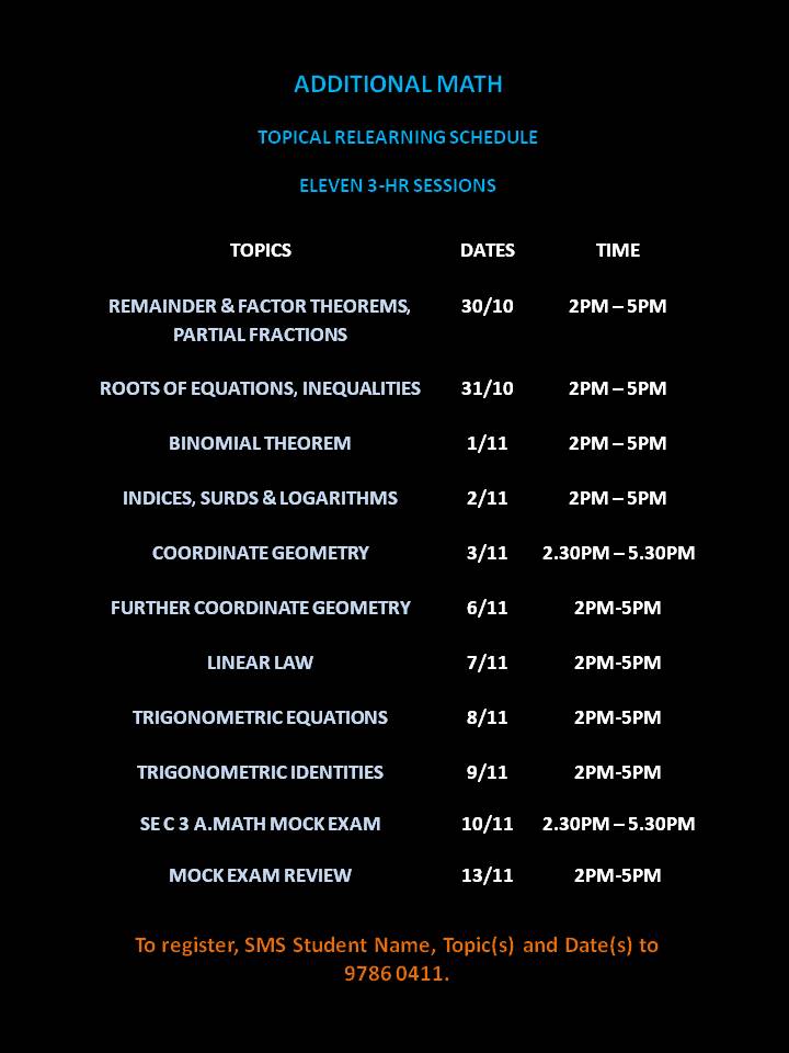 Target Group: Current Sec 3 students who wish to learn S4 A.Math so as to be better prepared for their O-level exams. Year 3 IP students are welcome to join.
