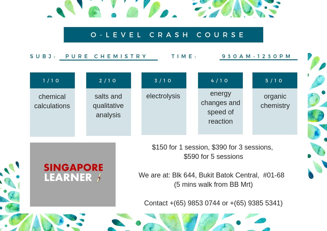 If you had not done well in your chemistry prelims, this is a good opportunity to take action and begin intensive preparation for your O-levels. In just under 3 hours each lesson, we will go through the key concepts in important topics, the common pitfalls or misconceptions, as well as popular O-level questions. Our tutors at Singapore Learner have come up with a holiday crash course program that covers all the topics in Chemistry with the highest weightage and difficulty, in order to ensure that you get the grade which you deserve.