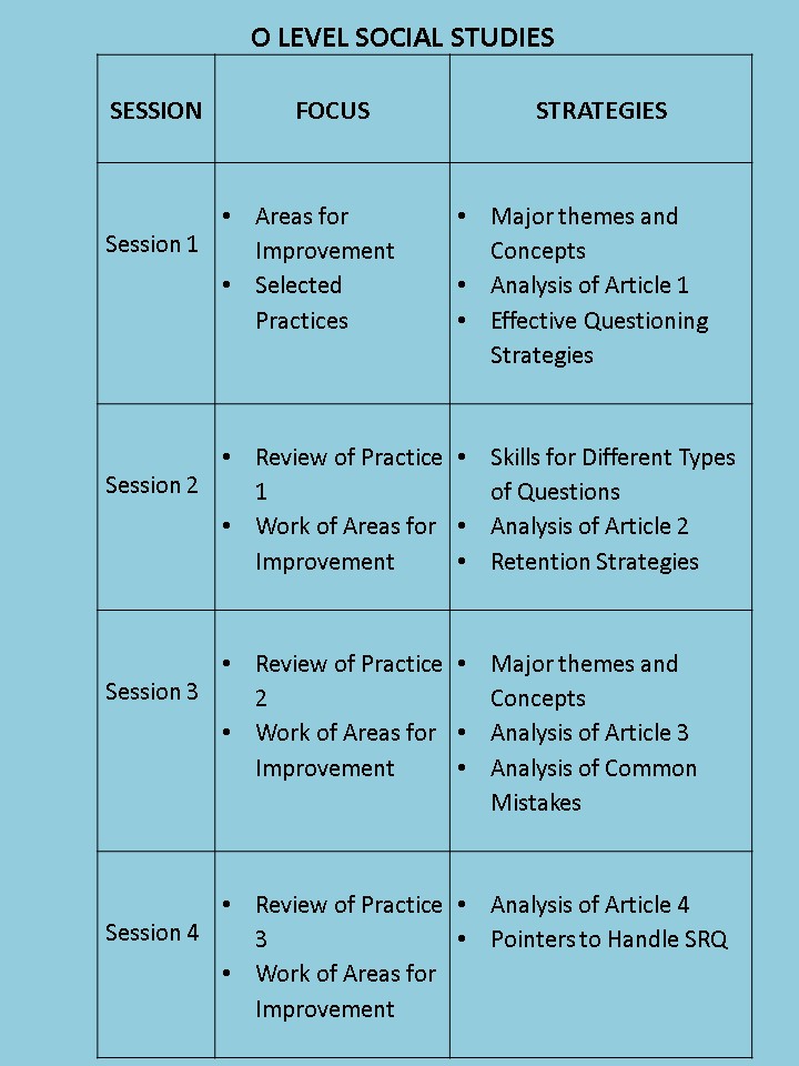 This four session programme will effectively guide and help students to appreciate and understand the demands of the wide SS syllabus, to be equipped with the core  answering skills for Source-Based Question (SBQ) items relating to Inference, Comparison, Usefulness, Reliability and Evaluation, and to tackle Structured Response Questions (SRQ) based on the Levels of Response Marking (LORMS). All these fundamentals will be clearly explained during the course to enable the students to gain confidence and interest in the subject. This course will sharpen the thinking skills of students as well as engage them in creative ways to analyse topics, questions and sources. Students who lack the confidence or the appropriate skills to meet the challenging, academic demands of Social Studies, will benefit from this course. This intensive programme will have the following objectives: